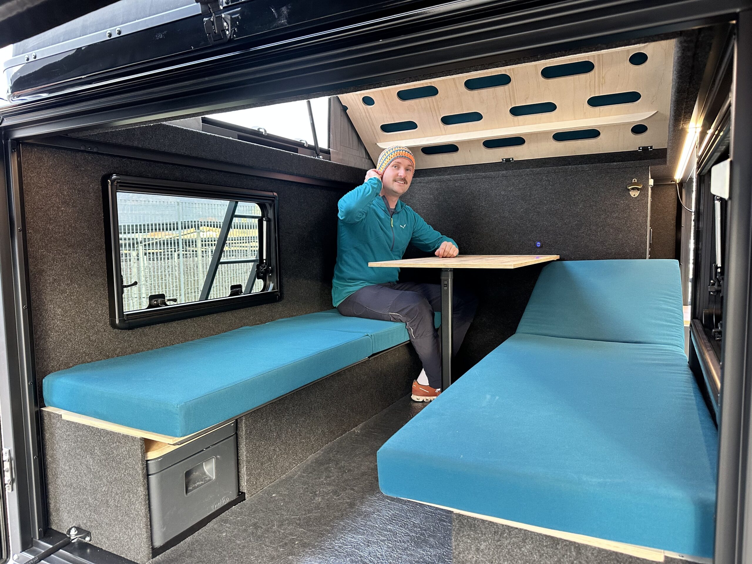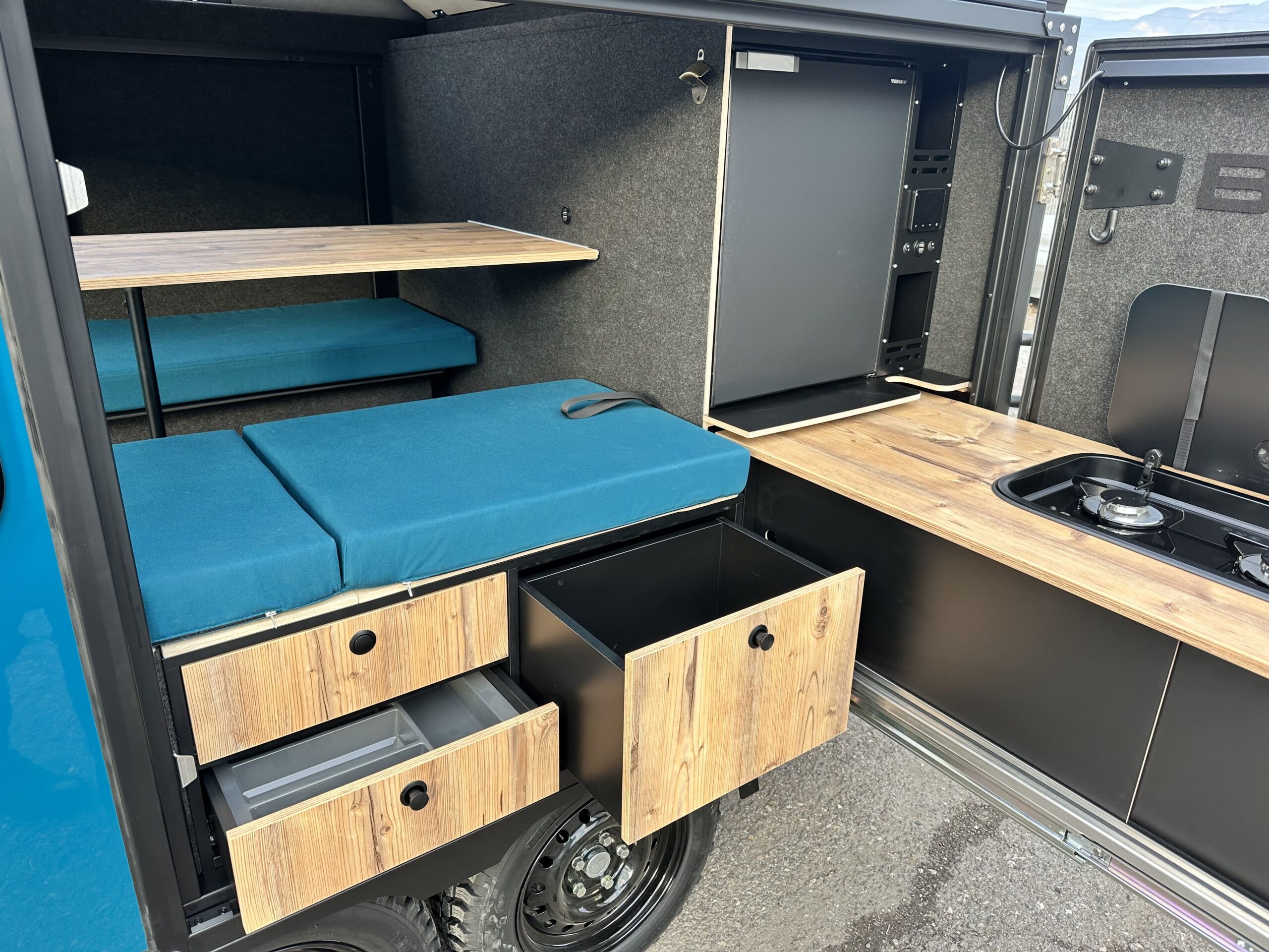 La vernice esterna blu oceano conferisce al veicolo un aspetto elegante. Il peso totale ammesso di 1.300 kg offre ampio margine per attrezzatura, biciclette e equipaggiamento da campeggio.